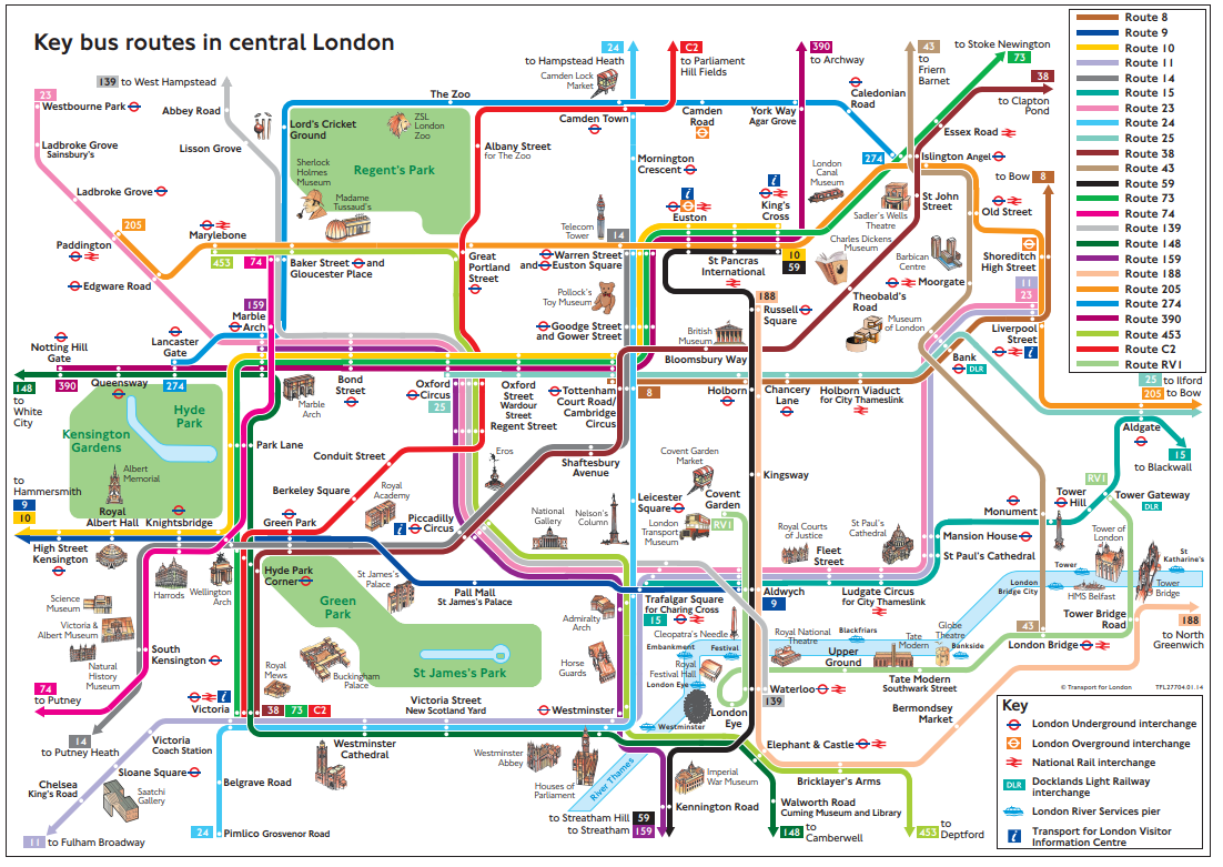 런던을 상징하는 2층버스는 런던 시내 곳곳을 다니는데요. 관광객들이 주로 이용하는 노선은 24개 정도입니다. 요금은 오이스터 카드로 지불할 수 있으며 2023년 기준으로 일반 요금은 1.5파운드입니다.(현금은 사용할 수 없어요) 운행 시간은 노선에 따라 다르지만 대체로 오전 6시부터 밤 12시까지 운행합니다.