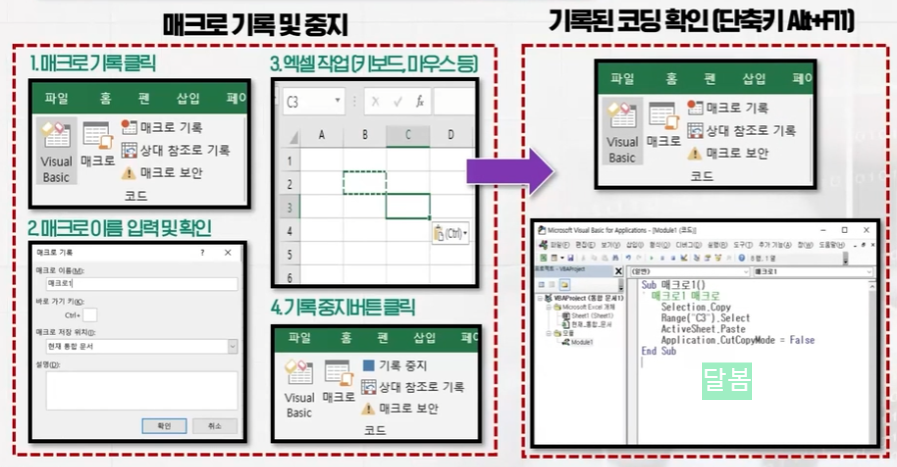 - 매크로 기록기를 실행하면 엑셀에서 하는 모든 키보드, 마우스 동작을 VBA코딩으로 기록함