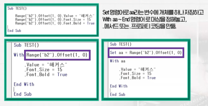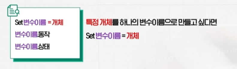 Set 명령어로 개체를 하나의 변수 이름으로 지정하면, 변수 이름으로 특정개체를 지칭해서 코딩이 가능합니다.