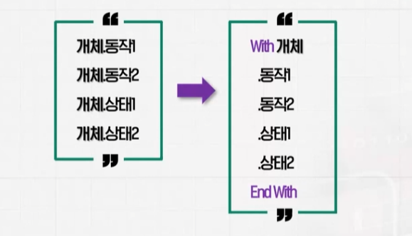 하나의 개체에 여러 동작이나 상태를 나타내는 경우에 With 개체 ~ End with 구문을 사용합니다.