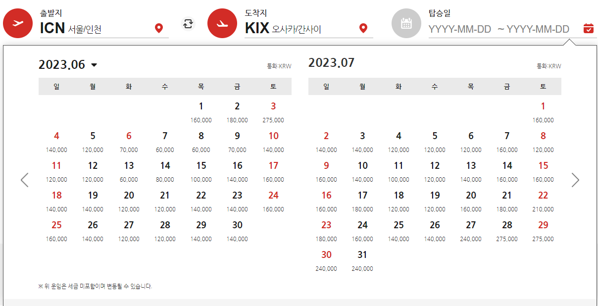 달력에 적혀있는 금액을 보시면 날짜만 잘 선택하면 정말 왕복 10만 원대로도 다녀올 수 있을 만큼 금액이 굉장히 저렴하게 나와있는데요.