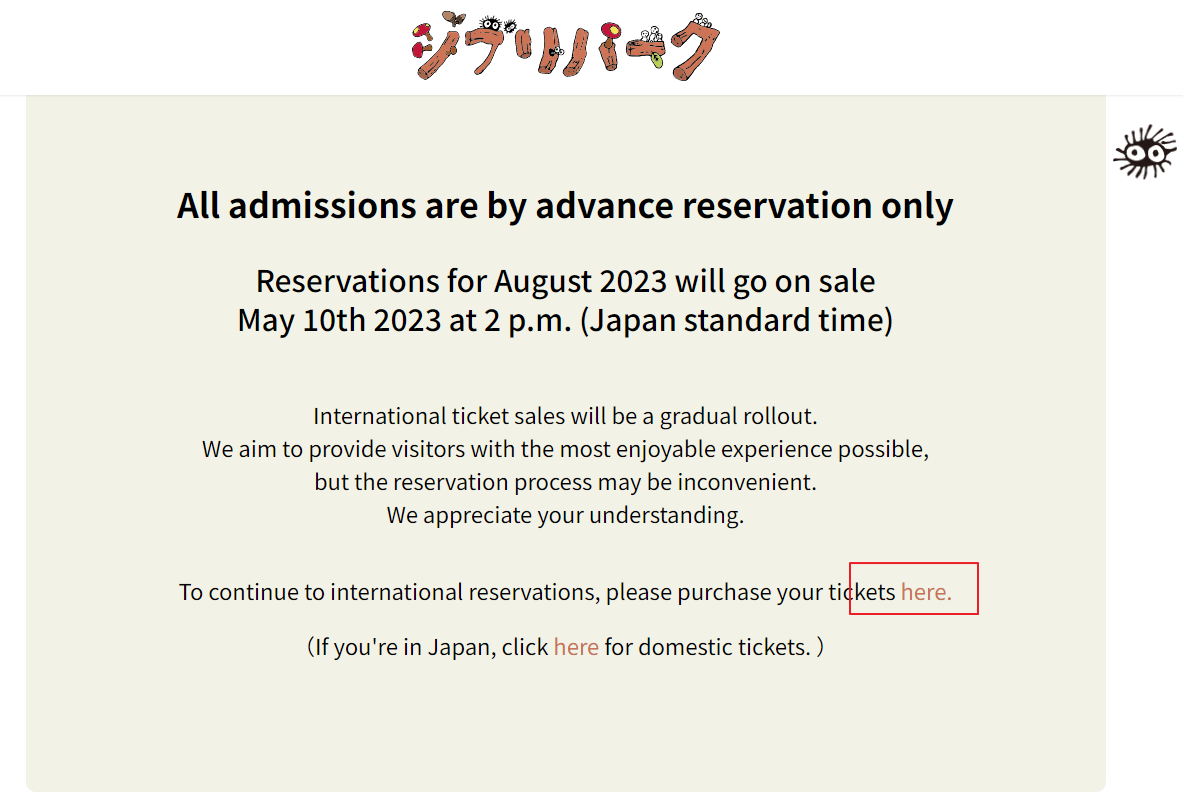 📌 지브리 테마파크는 사전 예약제로 진행되며 티켓은 공식 홈페이지를 통해 예약할 수 있습니다. 지브리 대창고 티켓은 평일 기준 2,000엔 주말 및 공휴일은 2,500엔이며 청춘 언덕과 돈도코 숲의 티켓은 각 1,000엔입니다. 워낙 인기가 많다 보니 구매하기 까다로워 여행 가시기 전 미리미리 준비하시길 추천드려요