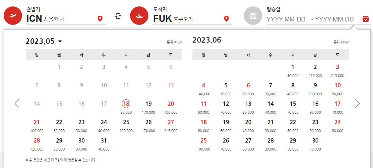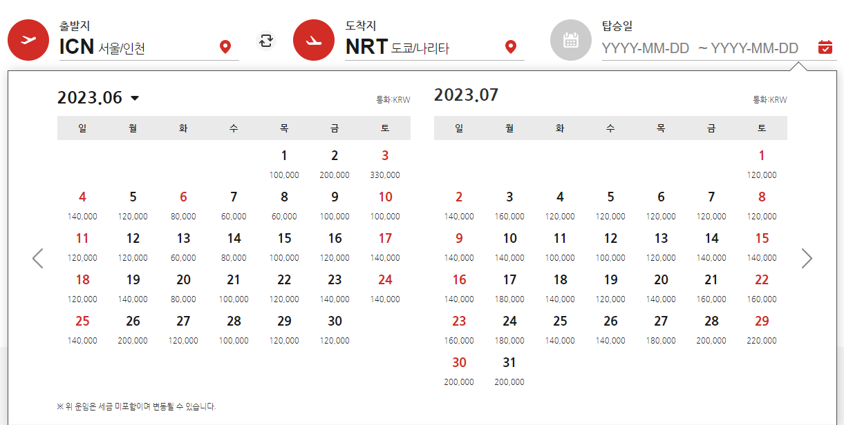 달력에 적혀있는 금액을 보시면 날짜만 잘 선택하면 정말 왕복 10만 원대로도 다녀올 수 있을 만큼 금액이 굉장히 저렴하게 나와있는데요.