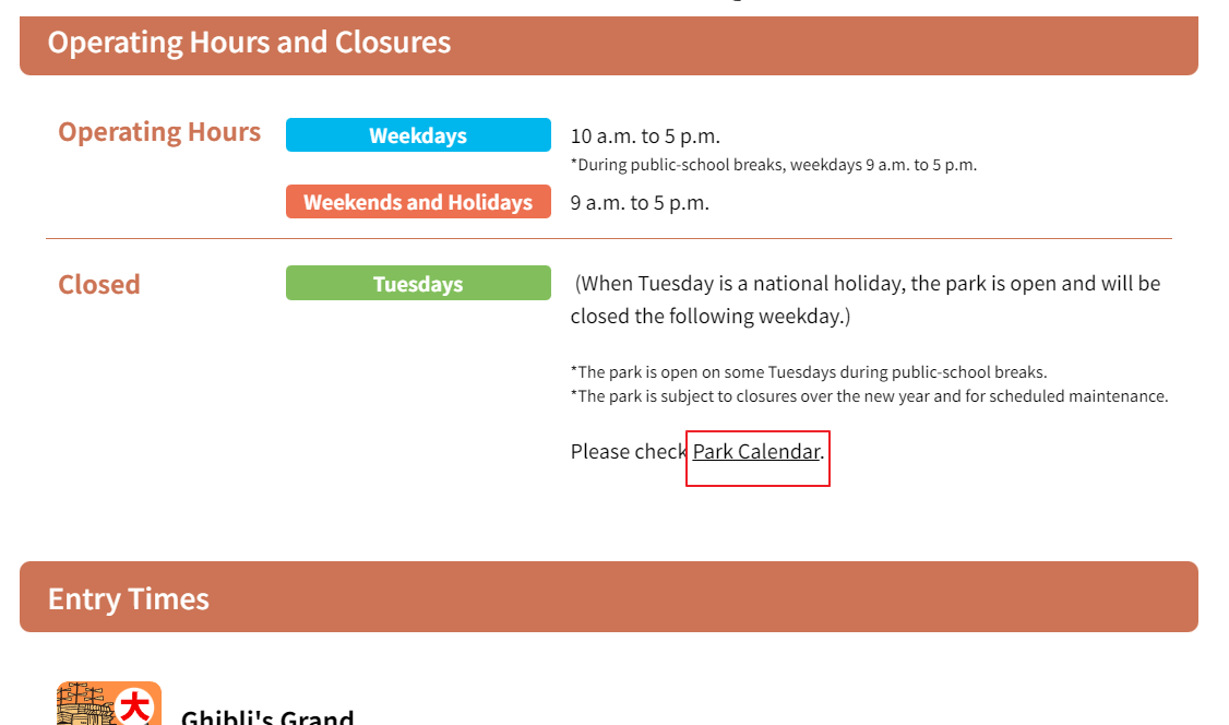 here 클릭 후 Park Calendar를 클릭해 쉬는 날을 먼저 확인해 줍니다.