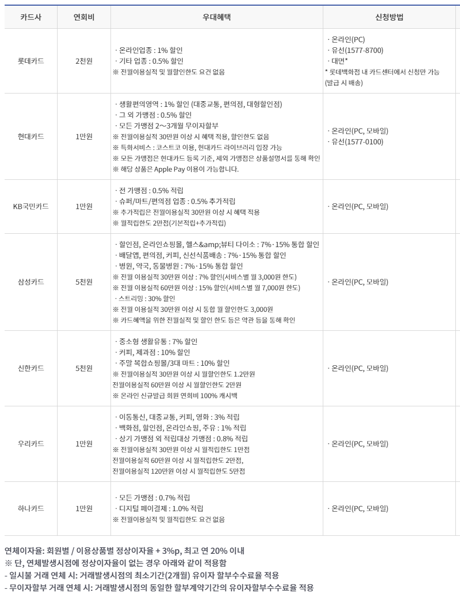 📌 카드 신청은 평일 6시~22시 중 가능, 전월이용실적 제외항목, 이벤트 등 세부내용은 해당 카드사에 문의하시면 됩니다.