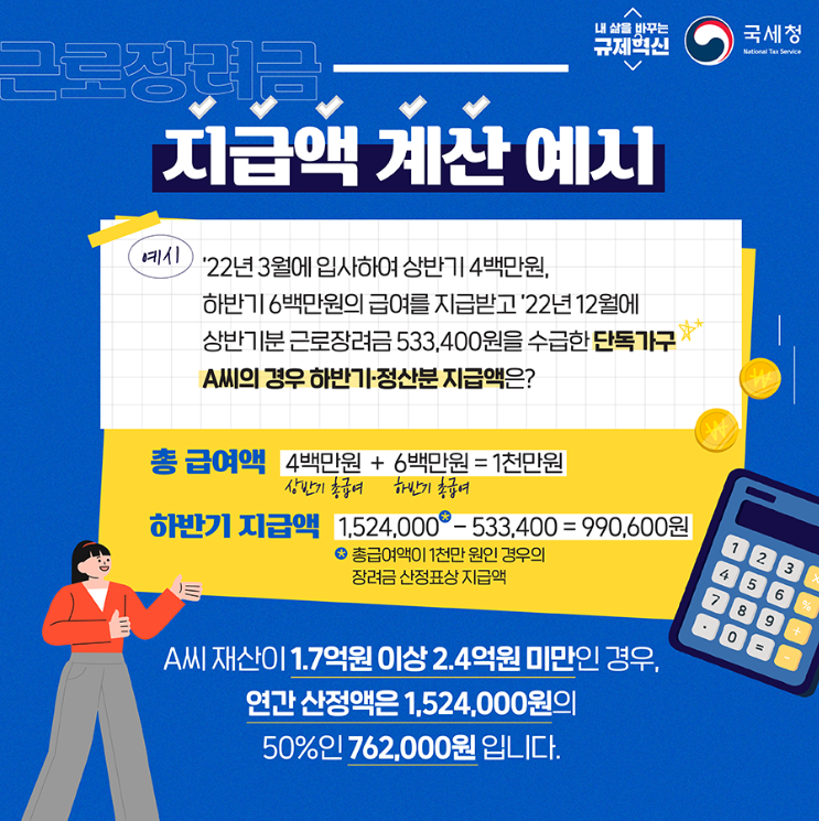 일은 하지만 소득이 적어 생활에 어려운 근로자, 사업자(전문직 제외) 가구에 대하여 가구원 구성과 근로소득, 사업소득 또는 종교인소득에 따라 산정된 근로장려금을 지급해 더 열심히 일할 수 있도록 근로를 장려하고 실직 소득을 지원하는 근로 연계형 소득지원 제도입니다.