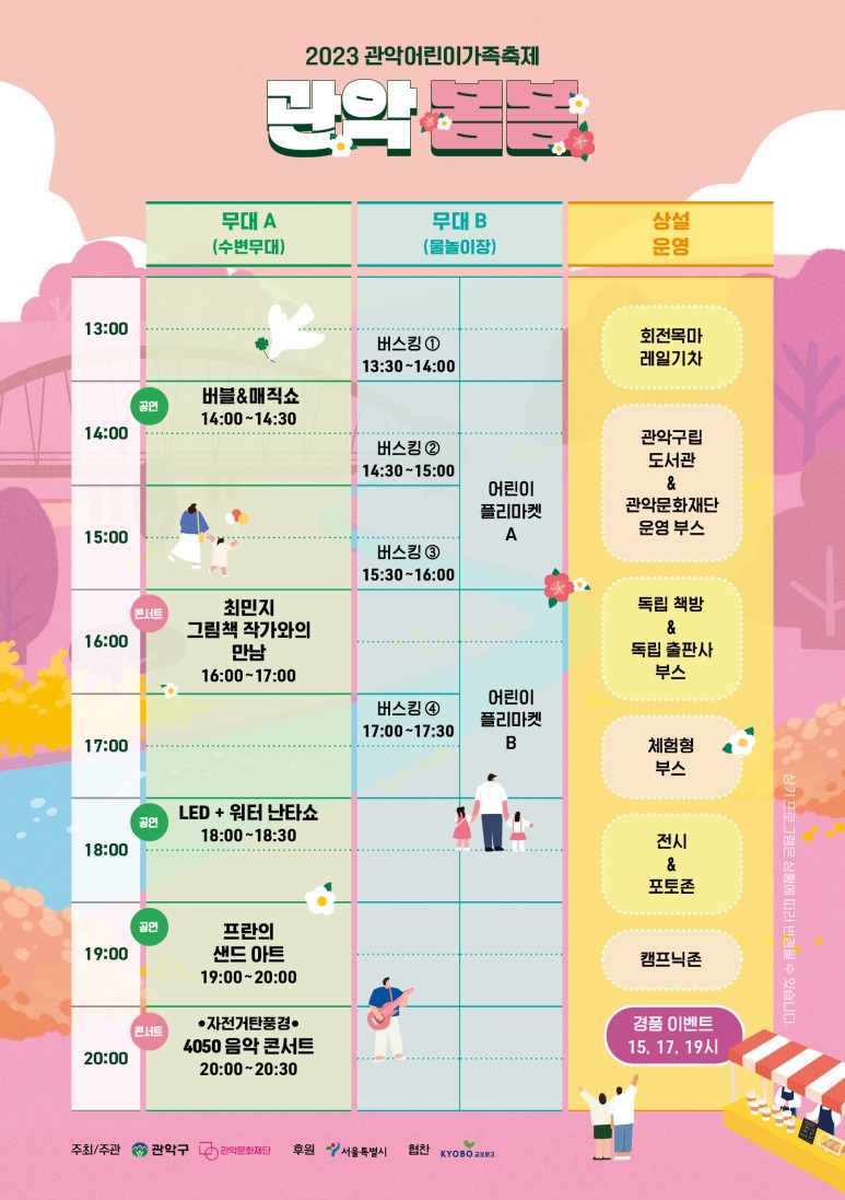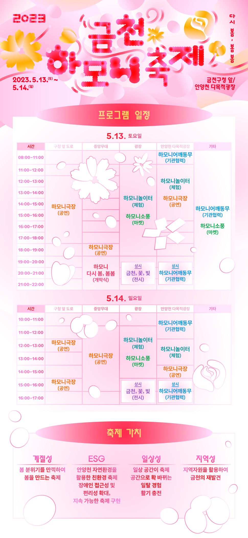 5.13 토~5.14 일, 금천구청 앞에서 주민 화합형 축제로 ‘다시 봄, 봄봄’을 하모니극장에서 선보이고, 놀이터(체험), 소풍(마켓), 전시 프로그램 등이 지역 문화예술인들의 참여로 펼쳐집니다.