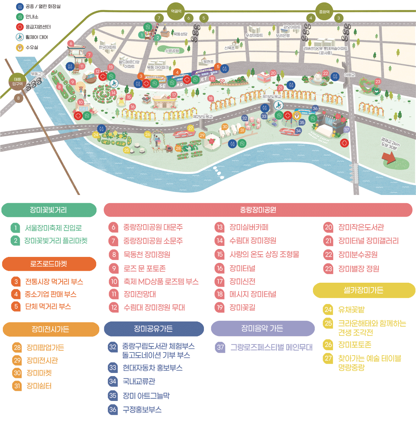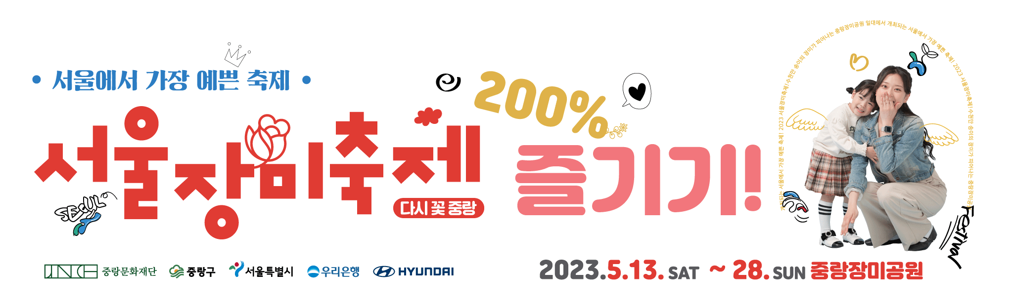 (5.13. 토~5.28. 일, 중랑장미공원 일대)에는 만개한 장미꽃과 함께 곳곳에 포토존이 준비되고 주말에는 퍼레이드, 음악회, 콘서트를 즐길 수 있다.