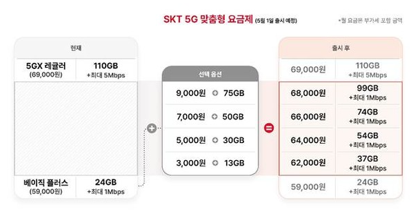 먼저 SKT는 '5G 맞춤형 요금제'를 내놨습니다. 기존 요금제인 '베이직플러스(24GB, 5만9000원)'을 기본으로 월 3000원(+13GB), 5000원(+30GB), 7000원(+50GB), 9000원(+75GB) 등 추가 데이터 옵션을 더하는 방식으로 각각의 옵션을 적용해 보면 월 6만2000원에 37GB, 6만4000원에 54GB, 6만6000원에 74GB, 6만8000원에 99GB 등 총 4가지 조합이 나옵니다.