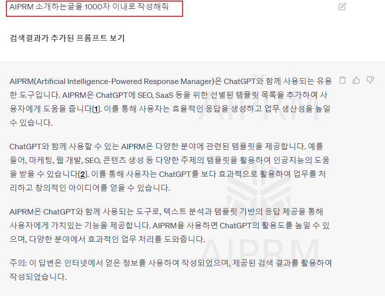 제가 확장프로그램을 이것저것 설치한 게 문제인 건지 아직 원활하게 사용을 하지 못하긴 하지만 일단 AIPRM을 이용하면 조금 더 쉽게 질문을 해도 형식에 맞춰 답변을 해주니 원하는 답변을 더 빠르게 얻어낼 수 있을 것 같아요.