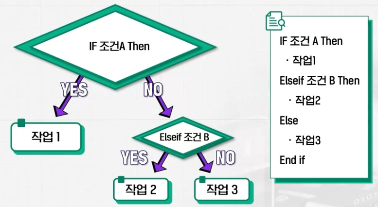 IF조건 A Then 작업 1 Else 작업 2 Endif : 만약 조건 A를 만족하면 작업 1, 아니면 작업 2를 작업
